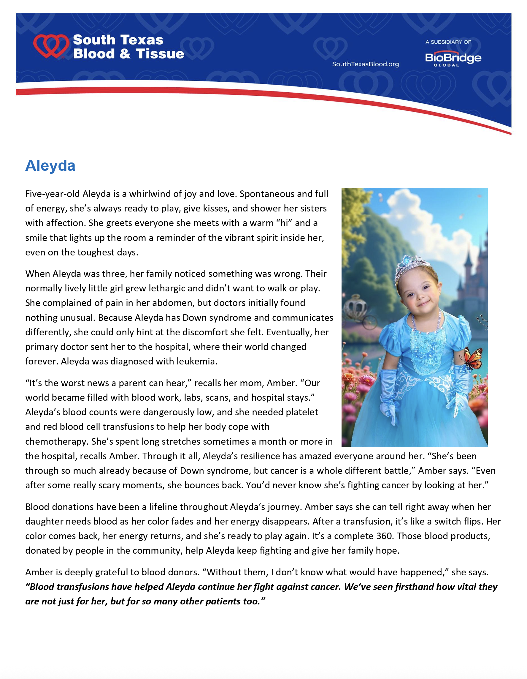 “Without them, [donors] I don’t know what would have happened,” she says. “Blood transfusions have helped Aleyda continue her fight against cancer. We’ve seen firsthand how vital they are not just for her, but for so many other patients too.”